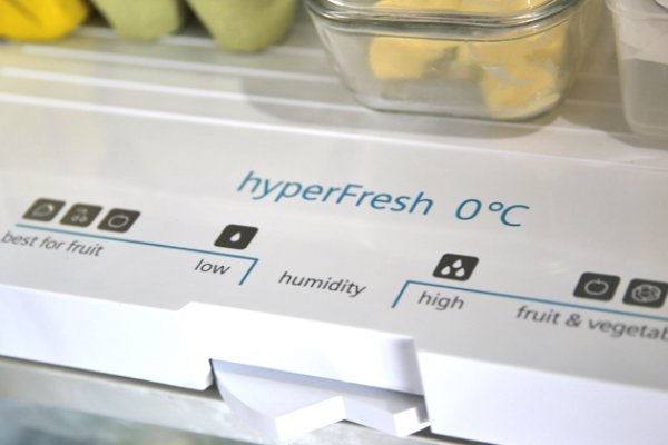 Für eine längere Frischhaltung sind sowohl Temperatur als auch Luftfeuchtigkeit entscheidend. Die hyperFresh premium 0°C Schubladen – eine für Obst und Gemüse mit Feuchtigkeitsregler sowie eine für Fisch und Fleisch – bieten dank unterschiedlicher Luftfeuchtigkeit überzeugende Vorteile. So bleiben Lebensmittel bis zu 3x länger frisch und die Vitamine wesentlich länger erhalten. Auch vermeiden die separaten Fächer unangenehme Geruchsübertragungen.