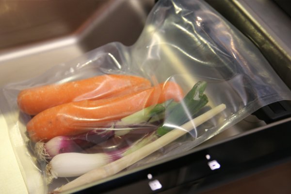 1. Ihre Speisen können Sie bereits vakuumiert kaufen oder eigene Kochideen zu Hause selbst eintüten: Einfach die Zutaten waschen und sorgfältig vorbereiten, evtl. schälen und mit etwas Butter, Salz und Gewürzen in den Beutel geben. Wenige Gewürze reichen bereits aus.
